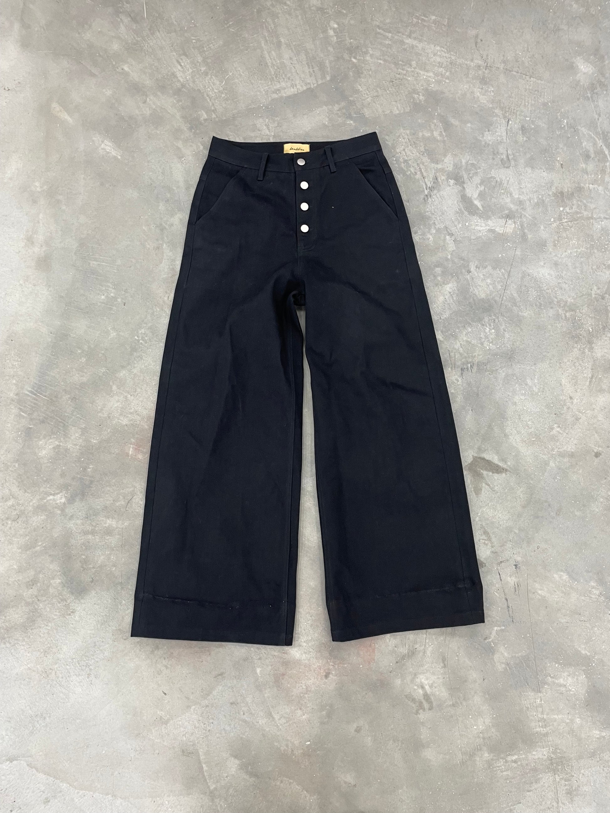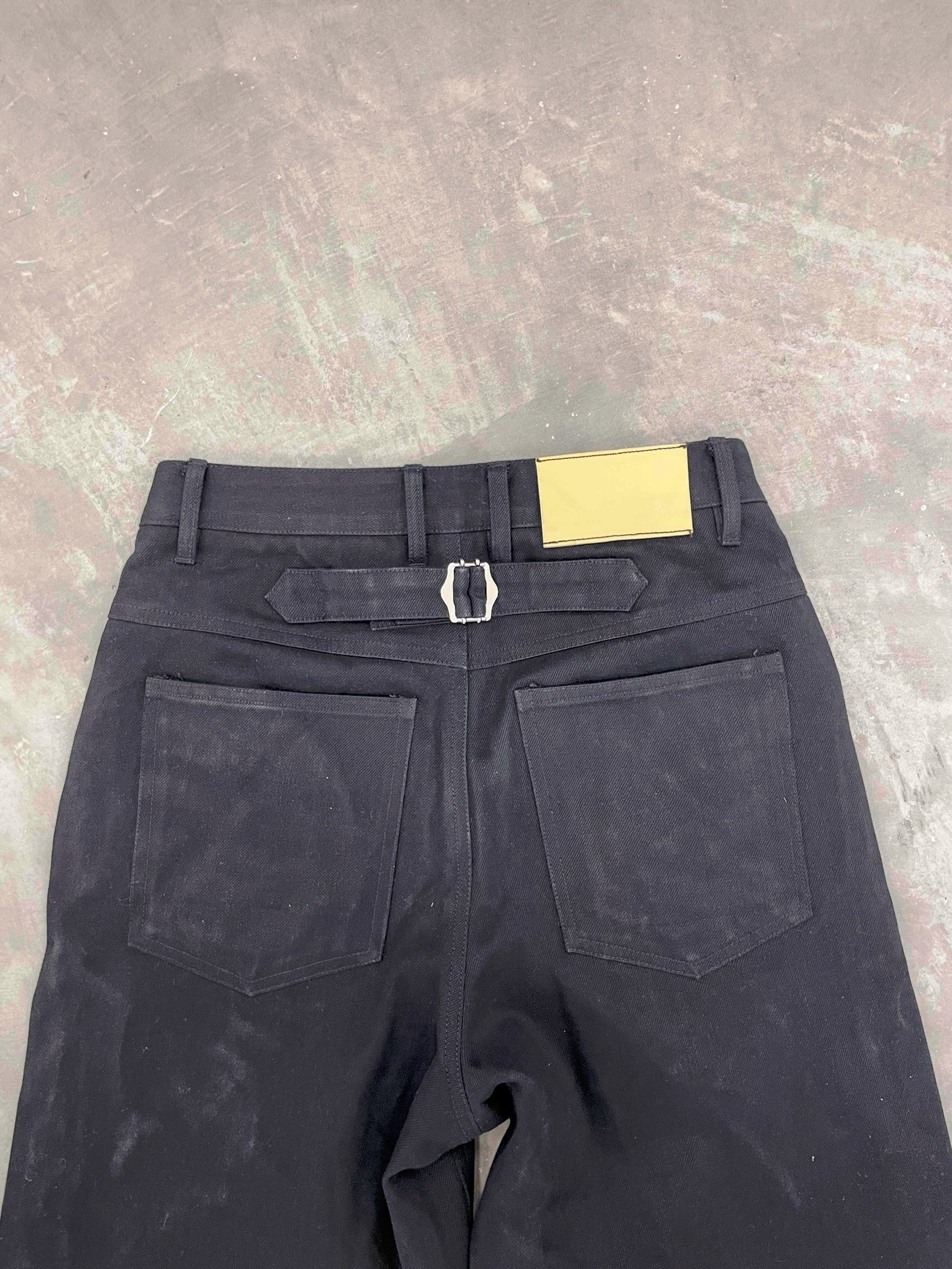 Made of a jet black 14oz selvedge. It has a backbuckle and an exposed buttonfly. They have a baggier fit than the last pair. THESE WILL BE PREORDERS!
